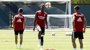 Encarnados realizam os habituais exercicios de aquecimento.